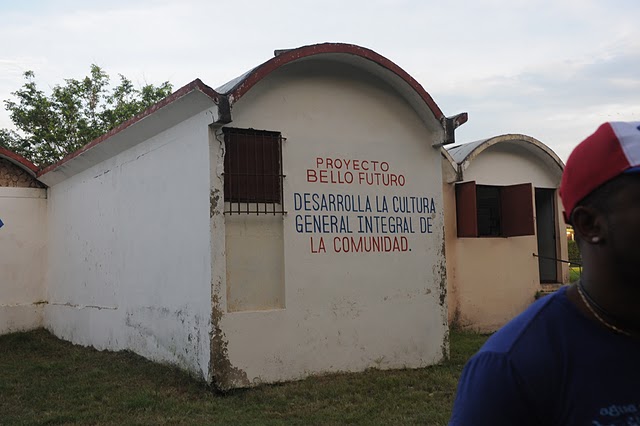 Bello 26 es un barrio de albergues para familias que perdieron sus viviendas. Sorprende gratamente que algunos hayan ido ampliando el espacio mínimo inicial y que con su esfuerzo hayan llegado a construir hasta casitas de dos plantas. Tienen un parque hermoso, muchos árboles. Allí acampamos. El camerino era la farmacia.
