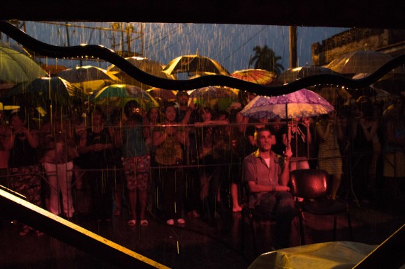 El concierto cae como el aguacero, empapa a todos, sin espantarlos. Está muy fría el agua. Húmedos hasta los huesos los vecinos del barrio permanecen. Los músicos lo mismo. Pocas cosas cobijan como una canción.